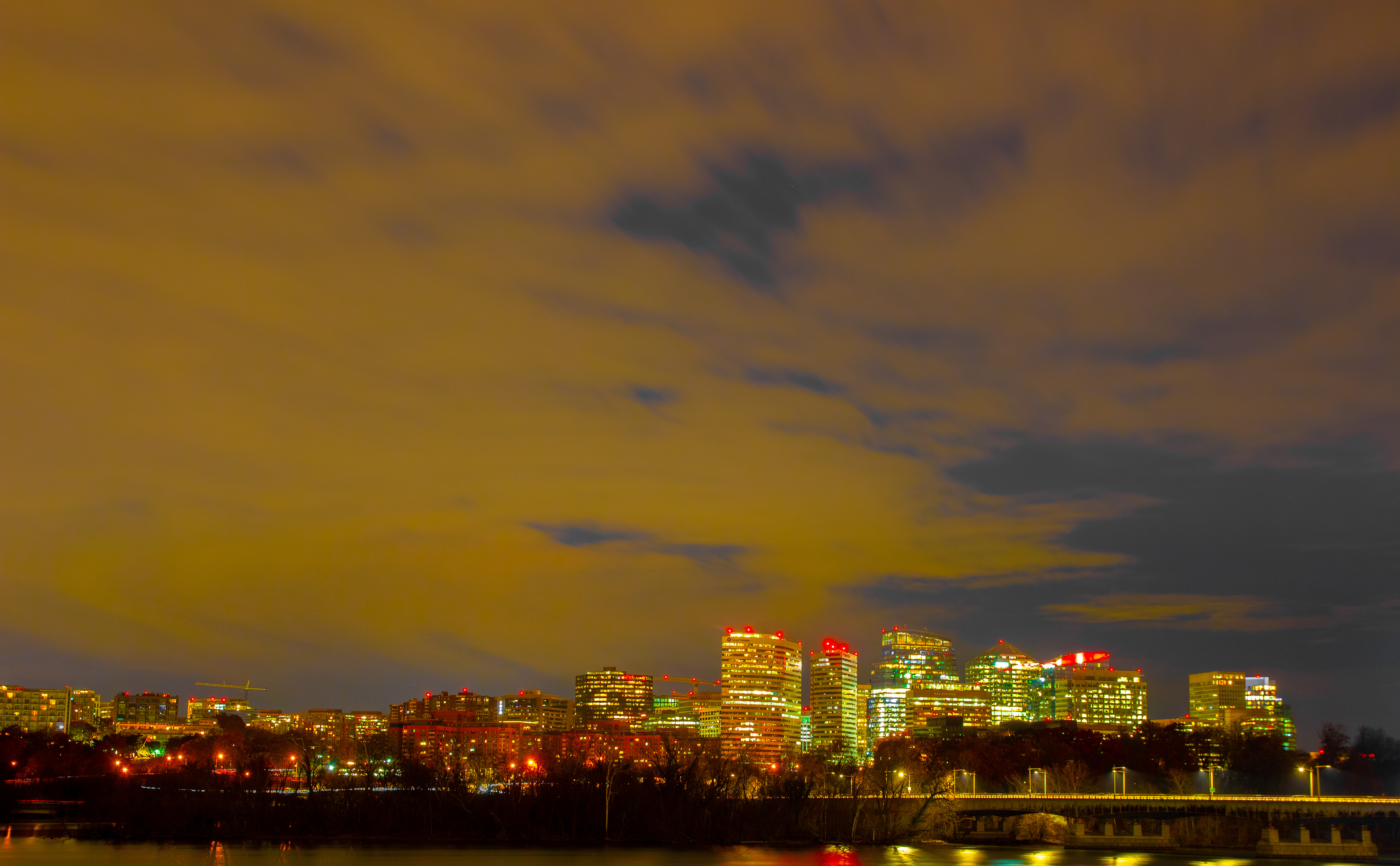 The Arlington, Virginia skyline. The view is from the Arlington Memorial Bridge (the Washington DC side of the bridge).